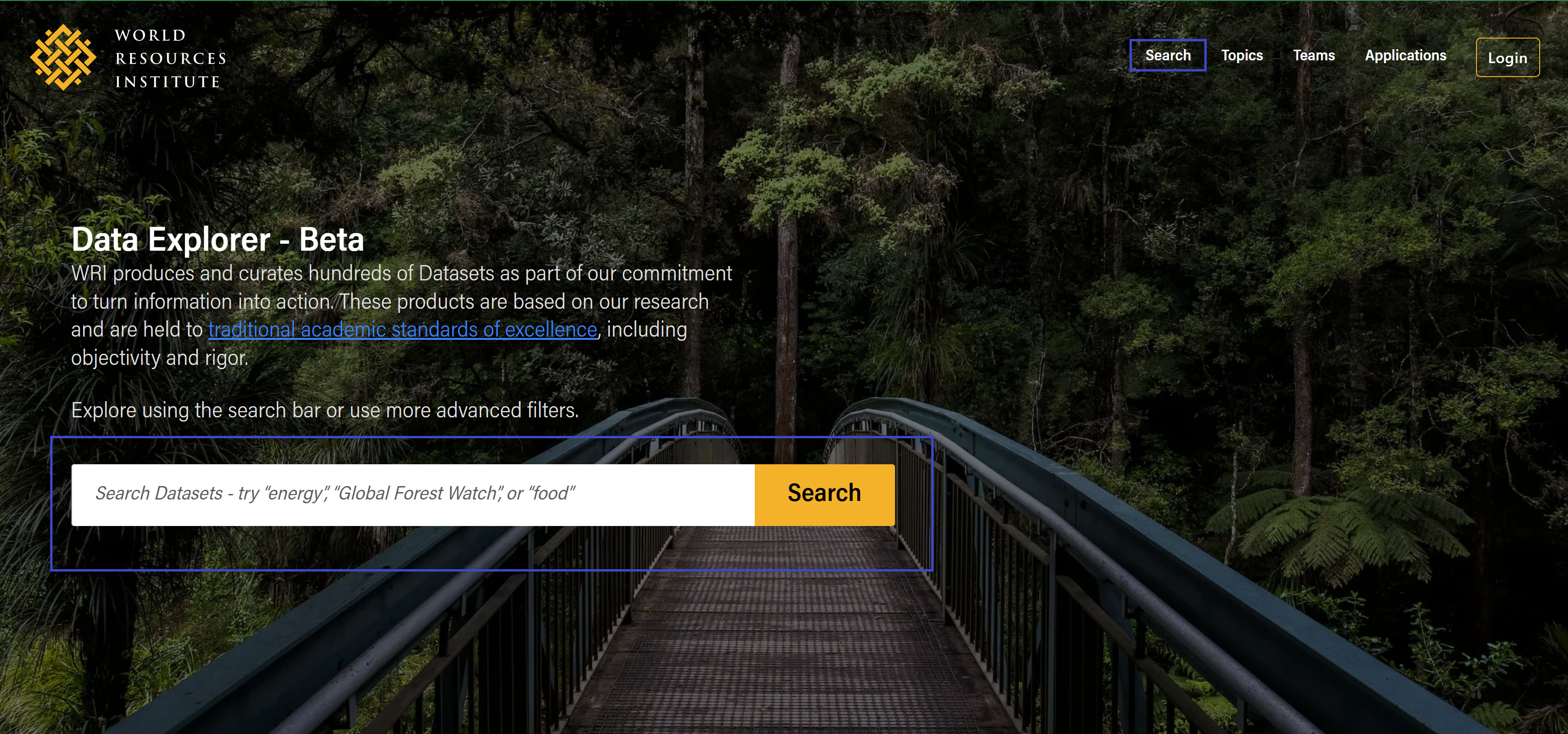Applications are WRI-owned platforms or digital products that use datasets also listed in the Data Explorer. In many cases, the application may be involved with the publication of the dataset or have a direct connection to the Team that owns it (they may even be the same entity). Unlike with Teams, a dataset can be associated with more than one application.