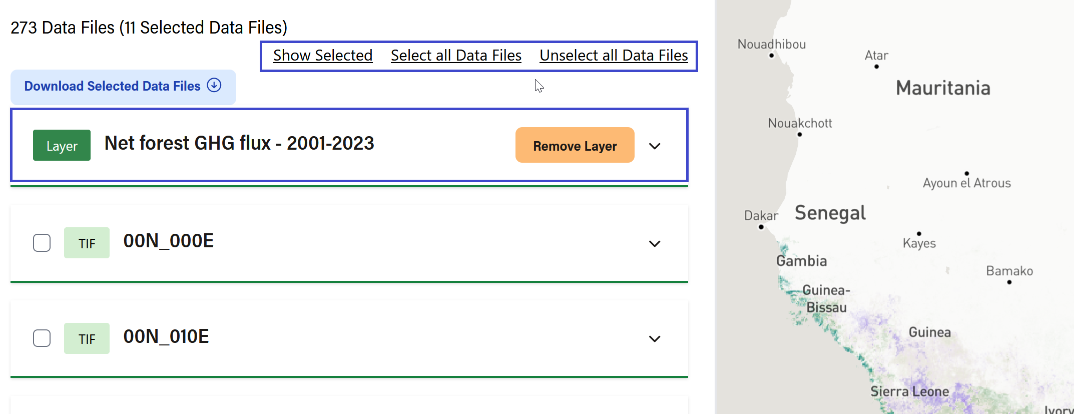 In this section, you will see a list of available Data Files. If you have used any of the above Search features, the relevant files will automatically be selected in this list. List filter options include: ‘Show Selected', ‘Select all', and 'Unselect all’. You can also manually select and deselect individual Data Files.